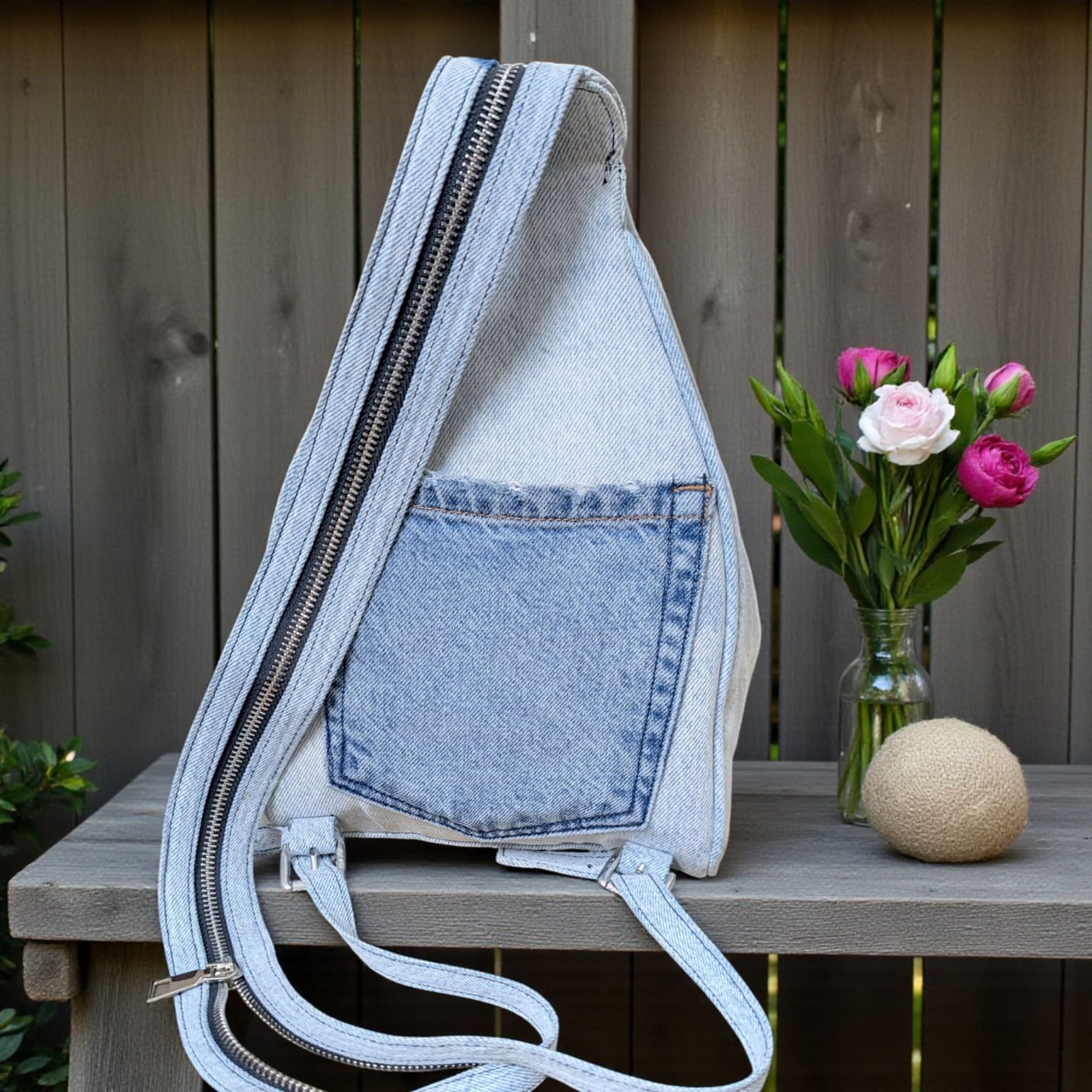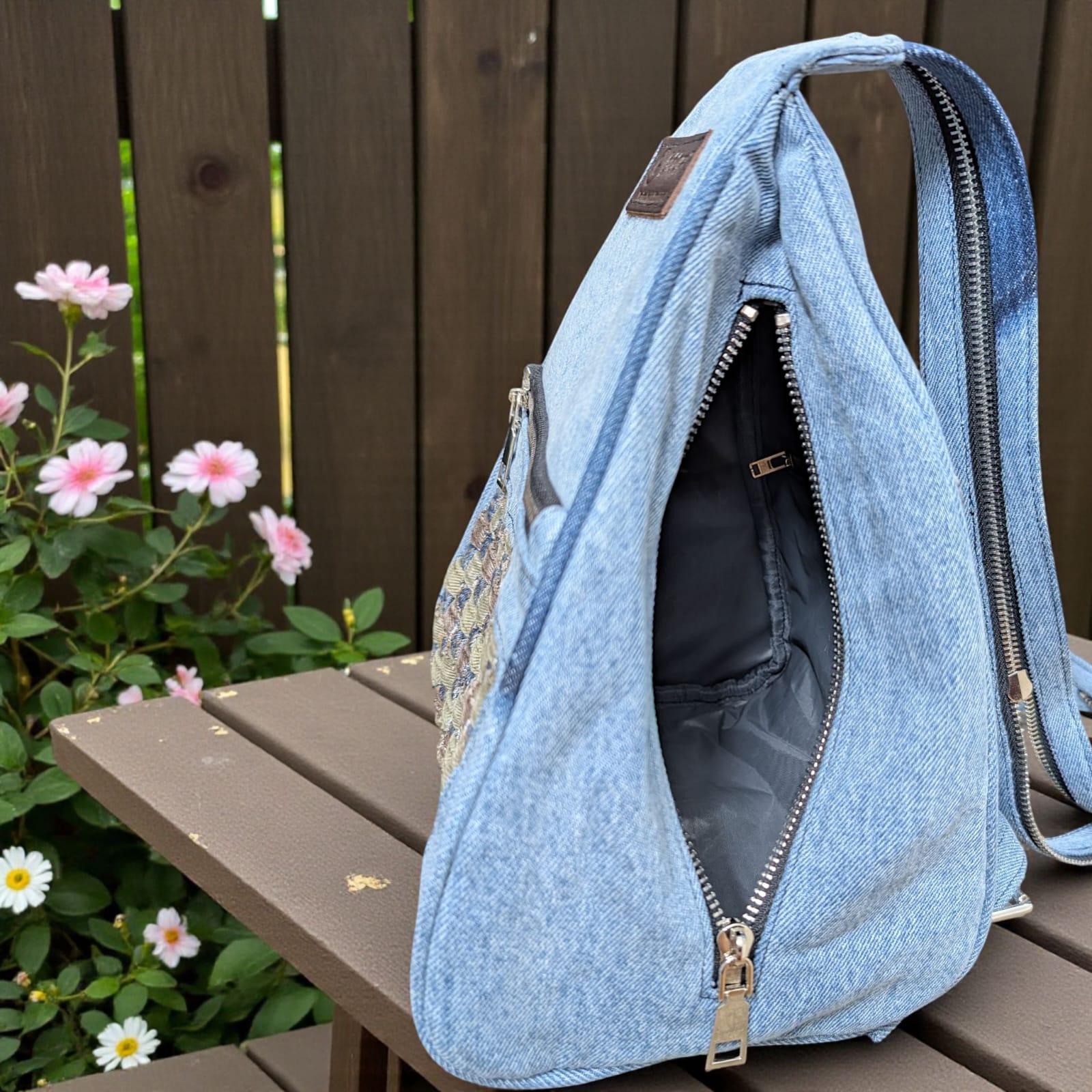 Introducing KakaTushi—the denim backpack that turns heads with its bold, unconventional design. This single-chamber pack features eye-catching patchwork detailing on the front and a stylish open jeans pocket on the back for quick access. Inside, a compact zippered pocket keeps essentials organized, while an exterior zippered pocket adds extra storage. But here's where it gets distinctive: the shoulder strap features an innovative chain mechanism that reveals two convertible belts, allowing you to carry it as a traditional backpack or switch up your style. Perfect for those who refuse to blend in, KakaTushi combines functionality with fashion-forward flair that sets you apart from the crowd.