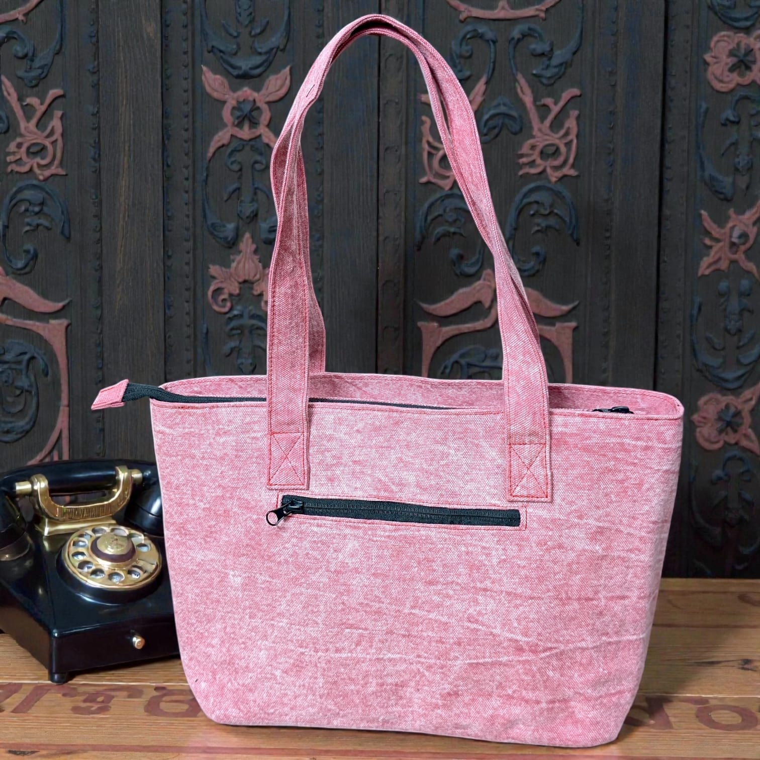 It features a spacious main compartment, a back zippered pocket for quick access, and three inner pockets—one with a zipper and two open slots for essentials. Sturdy handles and durable denim make it perfect for work or casual outings.