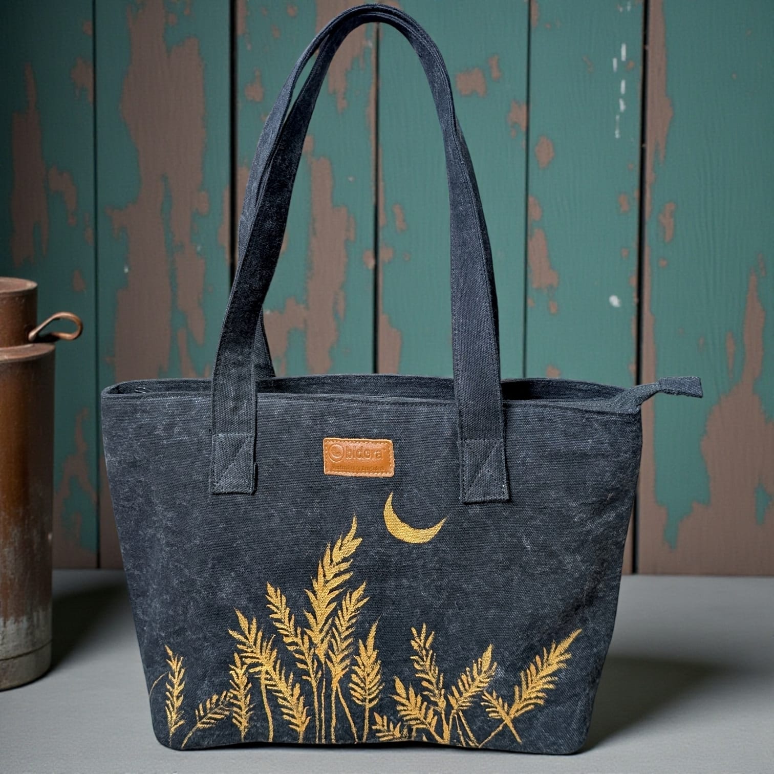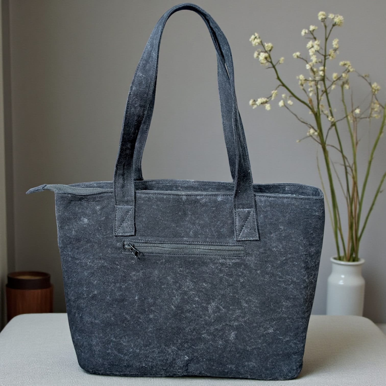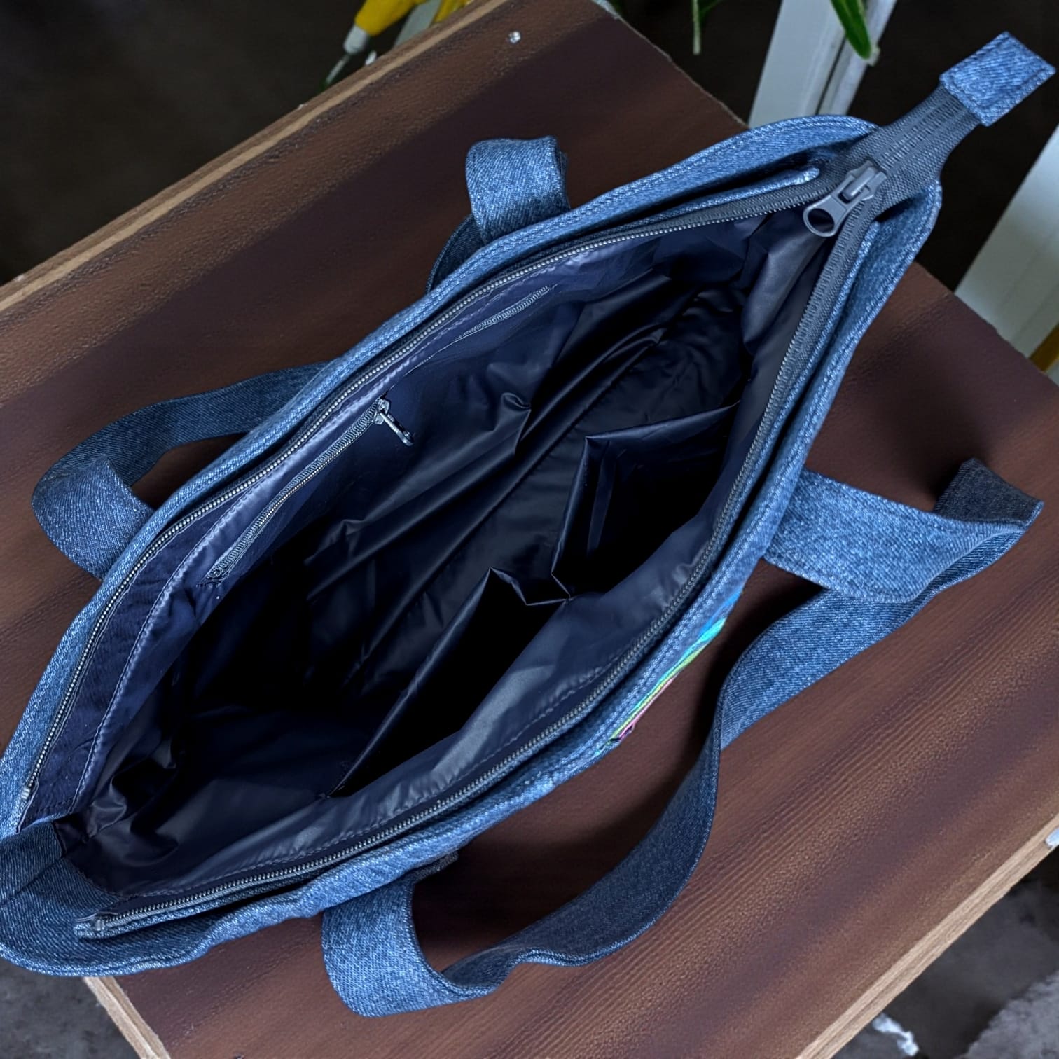 It features a spacious main compartment, a back zippered pocket for quick access, and three inner pockets—one with a zipper and two open slots for essentials. Sturdy handles and durable denim make it perfect for work or casual outings.