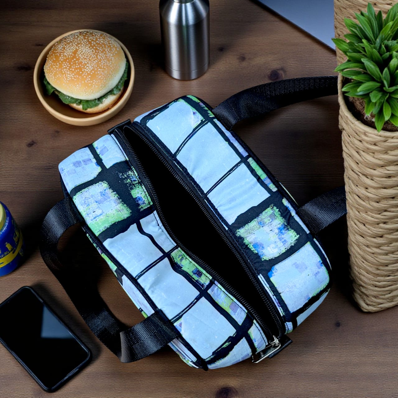 Carry your meals in style with our spacious lunch bag. It features a single main chamber to keep your food box protected and fresh. The short handle, made from imported twill fabric, offers a comfortable grip, while the front open pocket is perfect for keeping tissues or small essentials within easy reach.