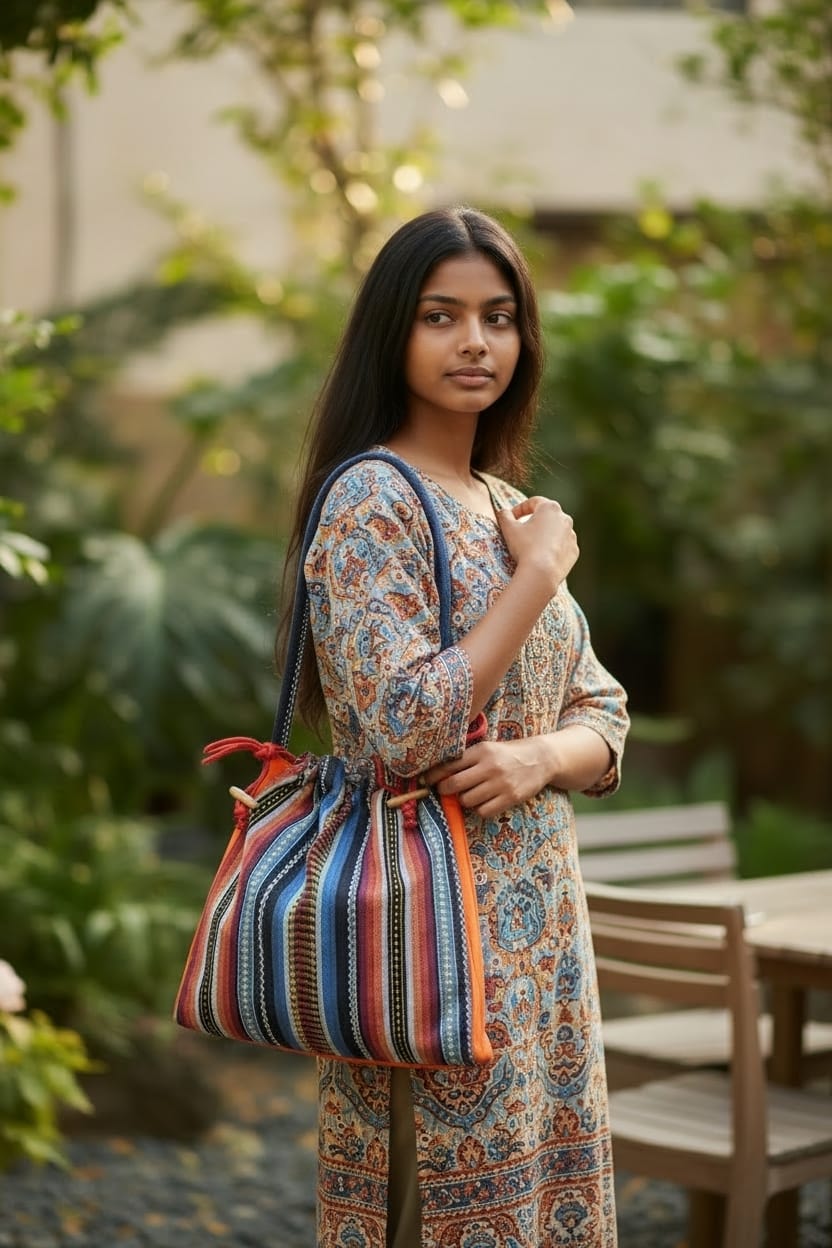 Carry your essentials in style with the Mimi Boho Stripe Drawstring Zippered Tote. This versatile bag features a spacious main chamber perfect for daily necessities, paired with a sturdy main handle for comfortable carrying. The dual-closure system—combining a practical drawstring and secure zipper—gives you flexibility in how you access and secure your belongings. Whether you're heading to the market, office, or weekend getaway, this thoughtfully designed tote keeps everything organized and within reach.