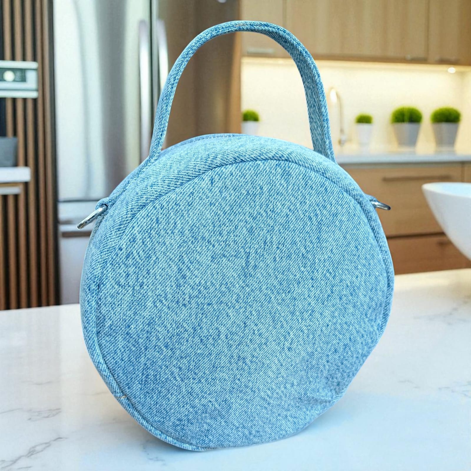 Carry style and convenience wherever you go with this chic round bag. It features one spacious main chamber to hold all your essentials, along with an inside open pocket for easy organization. The front side adds a stylish touch, while the adjustable denim belt ensures a comfortable fit for everyone. Perfect for daily outings or casual events, this bag combines fashion and functionality effortlessly.