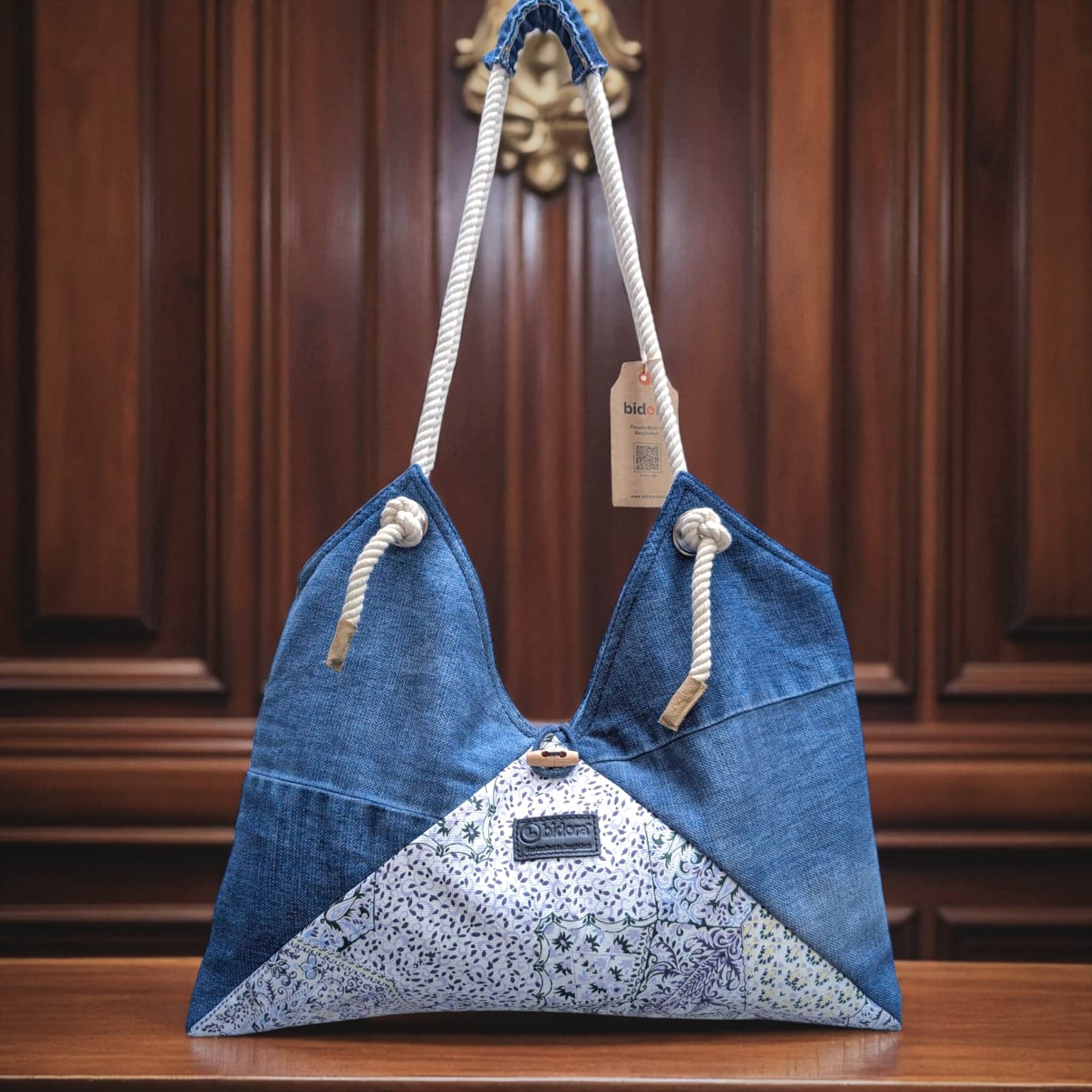 The sturdy rope handles add a modern touch while ensuring comfort on your shoulders. The floral patterned denim patch at the bottom gives the bag a unique, eye-catching look, making it versatile for everyday use.
